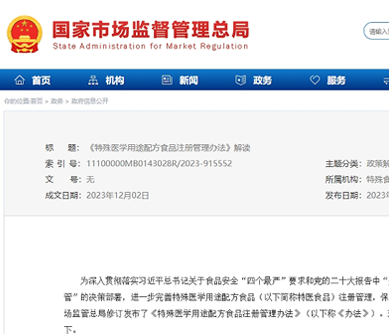 为深入贯彻落实习近平总书记关于食品安全“四个最严”要求和党的二十大报告中“关于食品药品安全监管”的决策部署,进一步完善特殊医学用途配方食品(以下简称特医食品)注册管理,保证产品质量安全,市场监管总局修订发布了《特殊医学用途配方食品注册管理办法》(以下称《办法》)。现就相关...